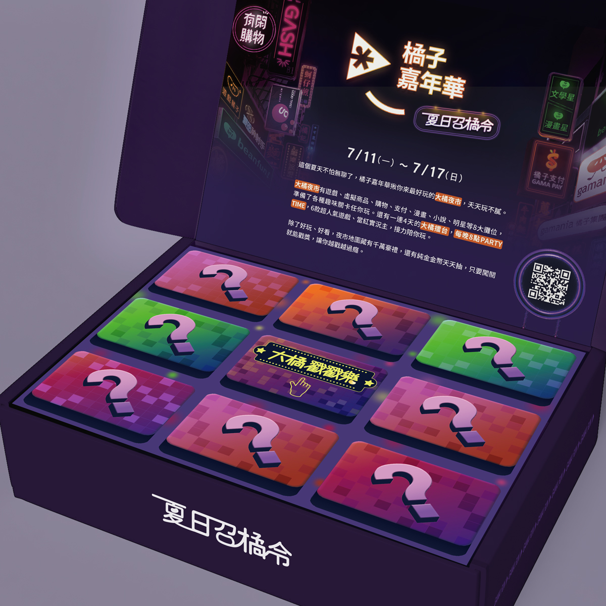 翻玩台灣夜市文化,將「遊戲橘子」集團的8大子品牌LOGO設計為夜市招牌翻玩台灣夜市文化,將「遊戲橘子」集團的8大子品牌LOGO設計為夜市招牌,七彩霓虹、絢爛煙火與萬千燈火,堆疊出的五顏六色的夏日祭典感,營造出熱鬧、歡樂的夏日嘉年華,號召所有玩家一起逛夜市。