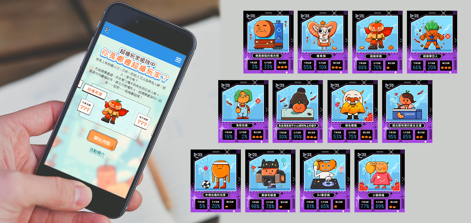 歡迎來到橘子嘉年華,化身結合遊樂園與賽博龐克美學,最流行的心理測驗,測驗你是哪一種超橘玩家,提升網友參與意願,打造獨特的互動體驗,藉由集團子品牌集點任務讓網友準時回訪,產生討論熱度並擴散潛在族群,打造最會玩的橘子嘉年華!提升集團品牌心佔率!