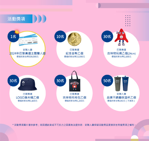購買保險商品即可參加抽獎,贏取限量版2024巴黎奧運紀念品,最高獎項更是價值50萬的雙人遊,引領您進入奧運精彩的世界